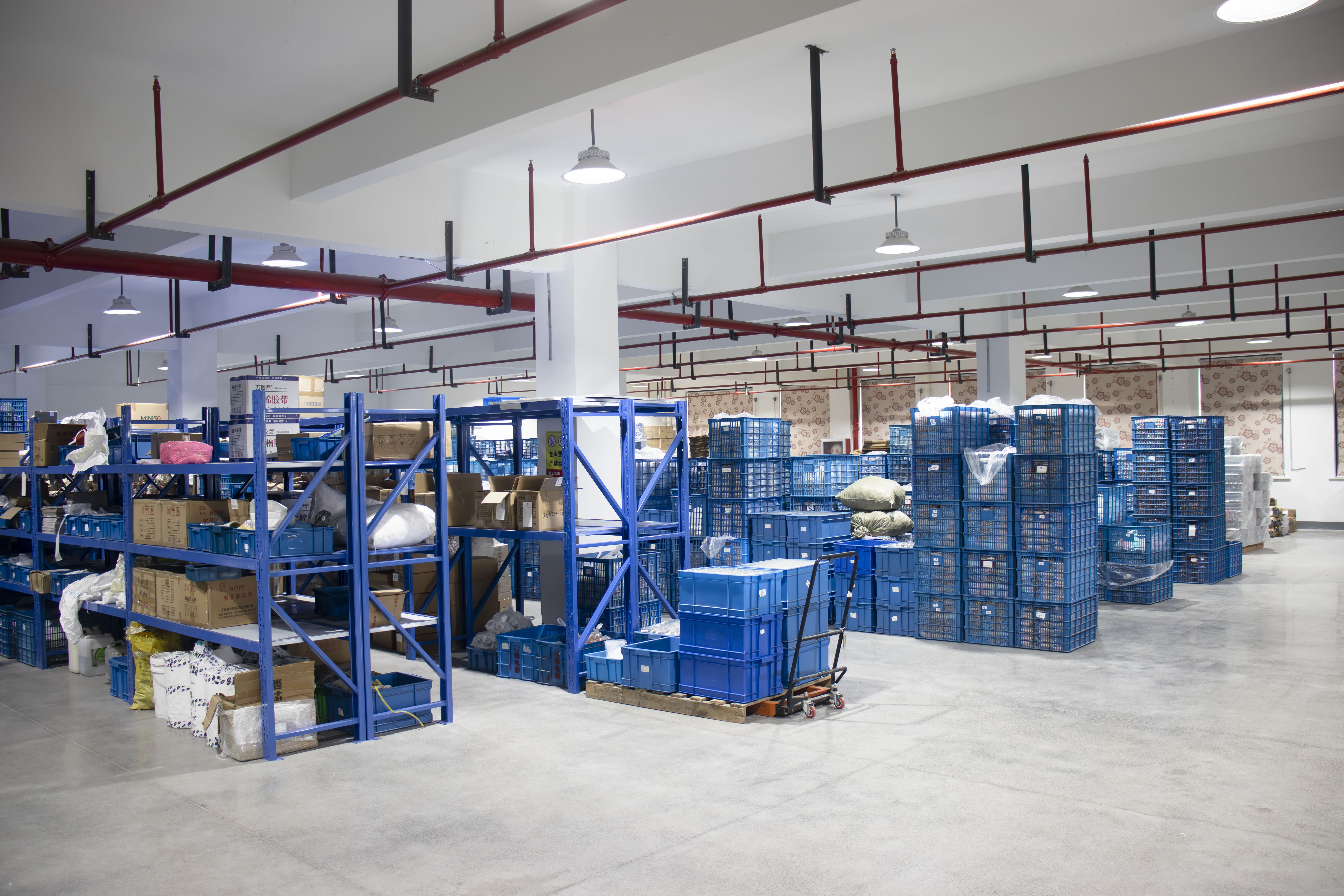 Il workshop presenta pavimenti epossidici azzurri con linee di demarcazione gialle, definendo chiaramente le aree di lavoro e i canali materiali. I componenti sono classificati in bidoni di stoccaggio blu, mentre le workstation di assemblaggio sono dotate di sistemi di illuminazione e ventilazione industriali senza ombra. Gli scaffali a più livelli posteriori conservano materiali di produzione, sincronizzati con terminali di controllo per monitorare l'utilizzo del materiale in tempo reale e ridurre al minimo i tempi di inattività.